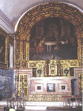 O altar é de mármore policromo da serra da Arrábida, e o retábulo dentro de uma boa moldura de talha dourada. seiscentista, representa a Ceia do Senhor.